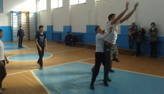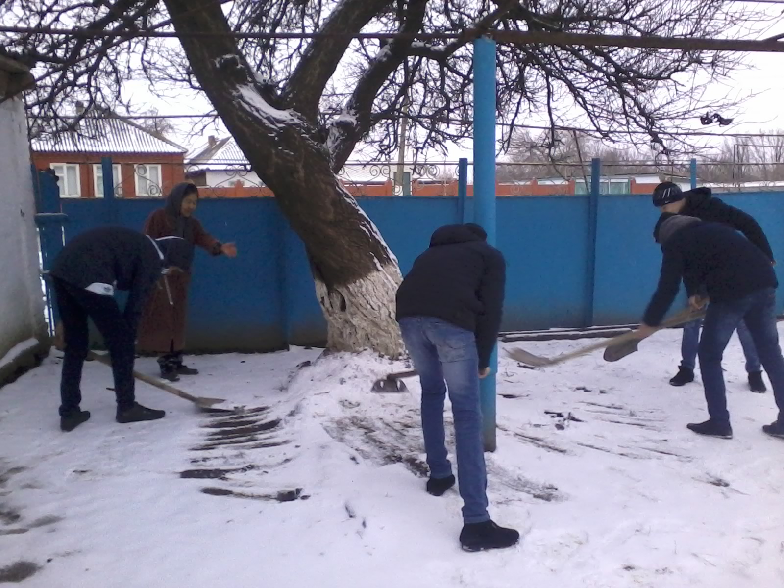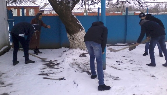 9 б класс. Мальчики на очистке двора от снега у Оразманбетовой М.Д.