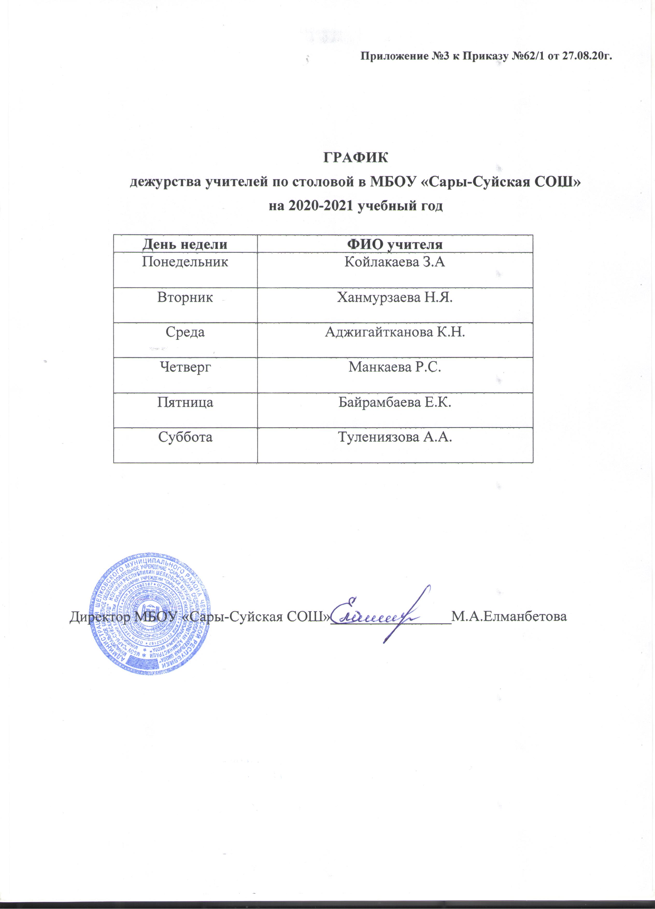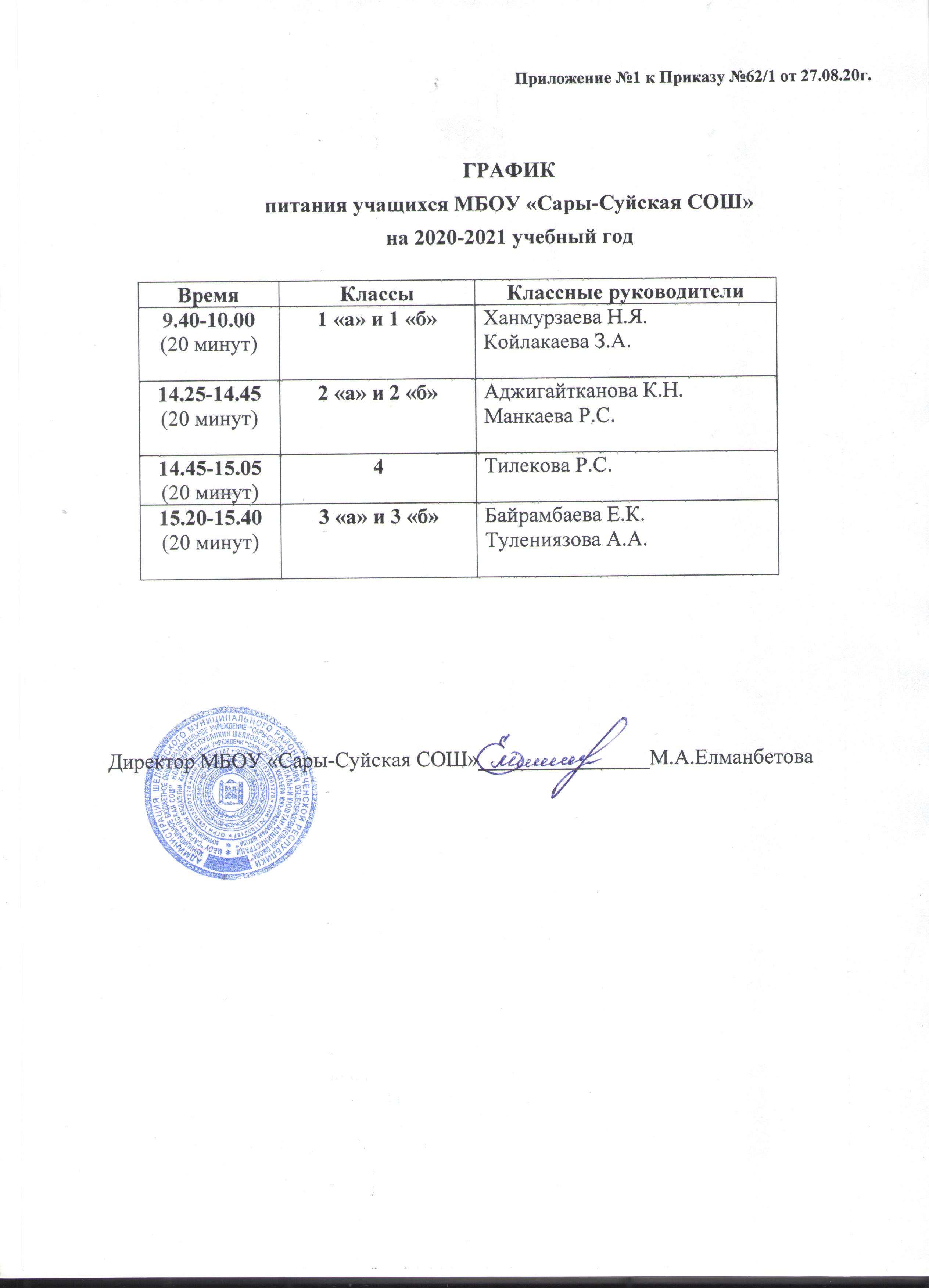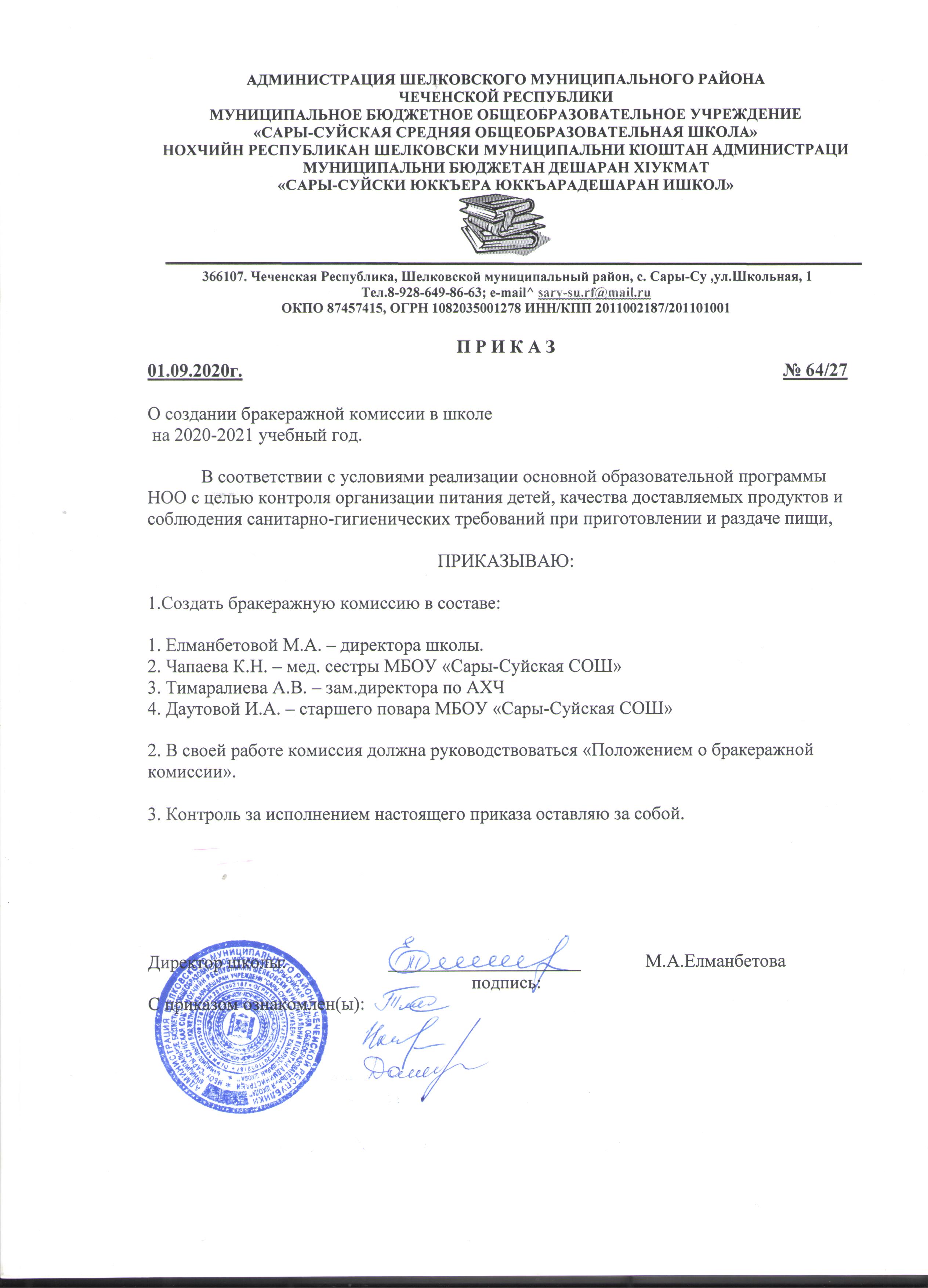 Скачать Двухнедельное меню МБОУ "Сары-Суйская СОШ" Скачать Федеральные методические рекомендации по организации питания Скачать Родительский контроль за организацией бесплатного горячего питания Скачать Перечень мероприятий по организации бесплатного горячего питания обучающихся Скачать План мероприятий по совершенствованию организаций питания обучающихся в МБОУ "Сары-Суйская СОШ" Скачать График контроля за состоянием СанПин на 2020-2021 учебный год Скачать Программа - Здоровое питание Скачать Приказ об утвержении Положения о порядке организации горячего питания обучающихся 1-4 классов в общеобразовательных учреждениях Шелковского муниципального района Скачать Приказ об организации горячего питания обучающихся начальных классов образовательных организаций Шелковского муниципального района Скачать Положение об организации питания обучающихся МБОУ "Сары-Суйская СОШ" Скачать Положение о бракеражной комиссии МБОУ "Сары-Суйская СОШ" Скачать Приказ об утверждении Положения об организации горячего питания в школах района Скачать Приказ МУ УО об организации горячего питания Скачать Положение об организации горячего питания в школах района Скачать Приказ №62/1 от 27.08.2020 г. Об организации горячего питания учащихся в школе Скачать График дедурства учителей в столовой в МБОУ Сары-Суйская СОШ на 2020-2021 учебный год Скачать График питания учащихся МБОУ "Сары-Суйская СОШ" на 2020-2021 учебный год Скачать График работы столовой МБОУ "Сары-Суйская СОШ" на 2020-2021 учебный год Скачать Приказ №64/63 от 01.09.2020 г. О назначении ответственного за организацию питания в МБОУ "Сары-Суйская СОШ" на 2020-2021 учебный год Скачать Приказ №64/27 от 01.09.2020 г. О создании бракеражной комиссии в школе на 2020-2021 учебный год Скачать Приказ о размещении телефона горячей линии Оперативного штаба по вопросам организации и качества бесплатного горячего питания для обучающихся, осваивающих образовательные программы НОО в МБОУ "Сары-Суйская СОШ" Скачать Приказ №889-n от 24.08.2020 о размещении телефона горячей линии Оперативного штаба по вопросам организации и качества бесплатного горячего питания для обучающихся, осваивающих образовательные программы НОО Скачать Перспективное меню питания школьников 7-11 и 11-18 лет МБОУ "Сары-Суйская СОШ"
