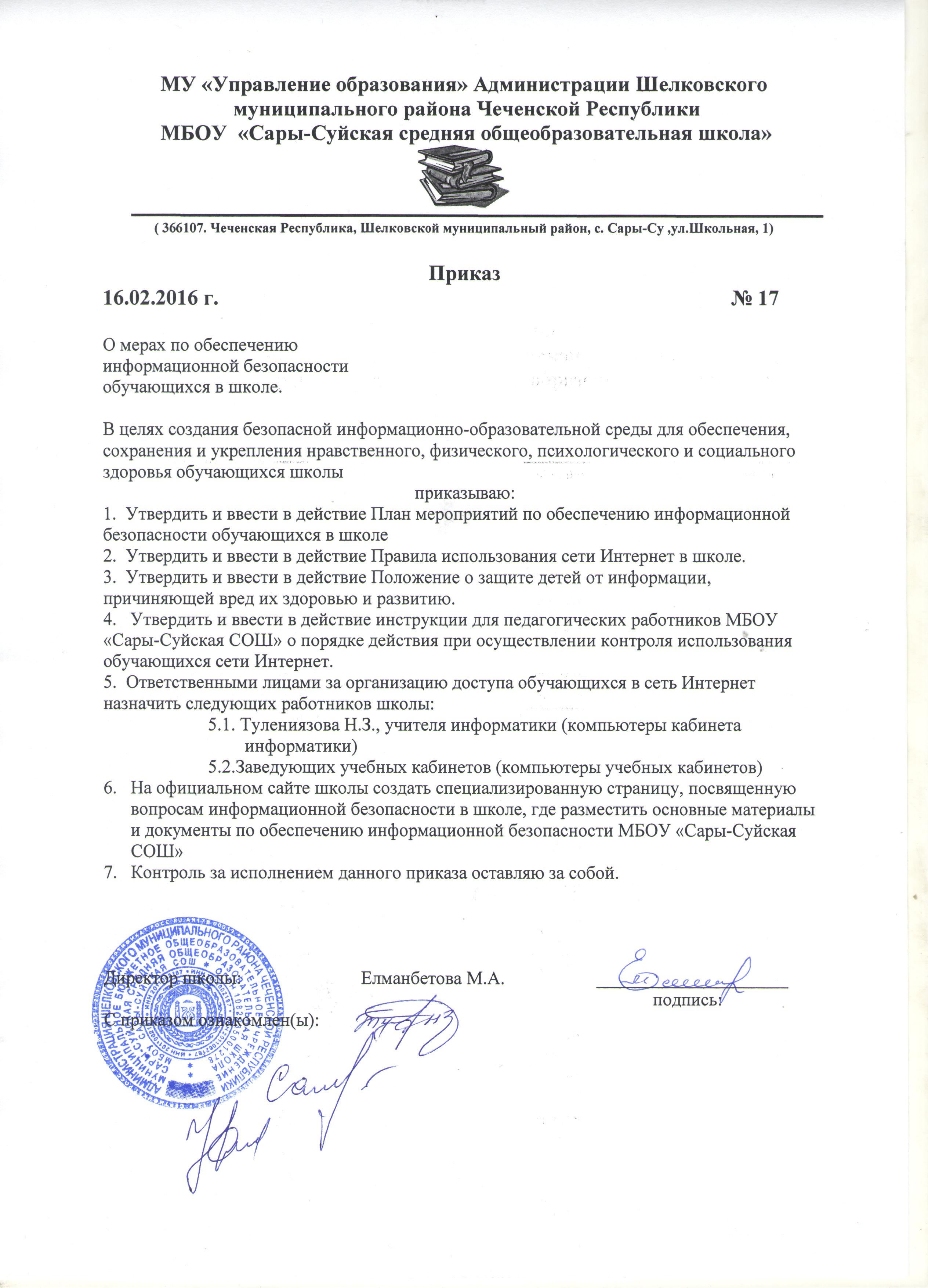 Приказ МБОУ "Сары-Суйская СОШ" О назначении ответственного за обработку персональных данных