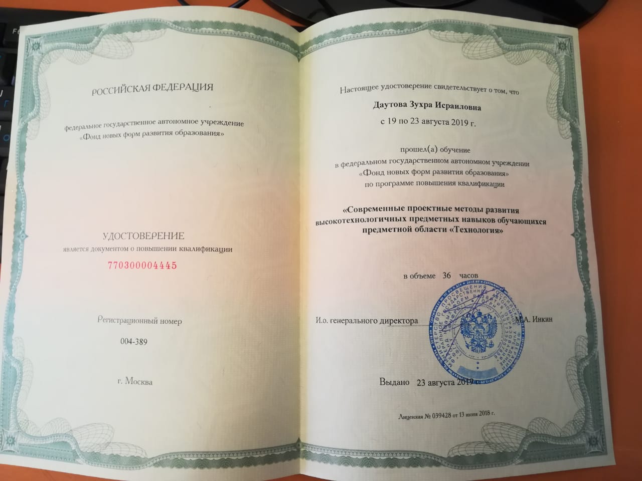 Учитель технологии Даутова З.И. прошла обучение на образовательной платформе "Фонд новых форм развития образования"