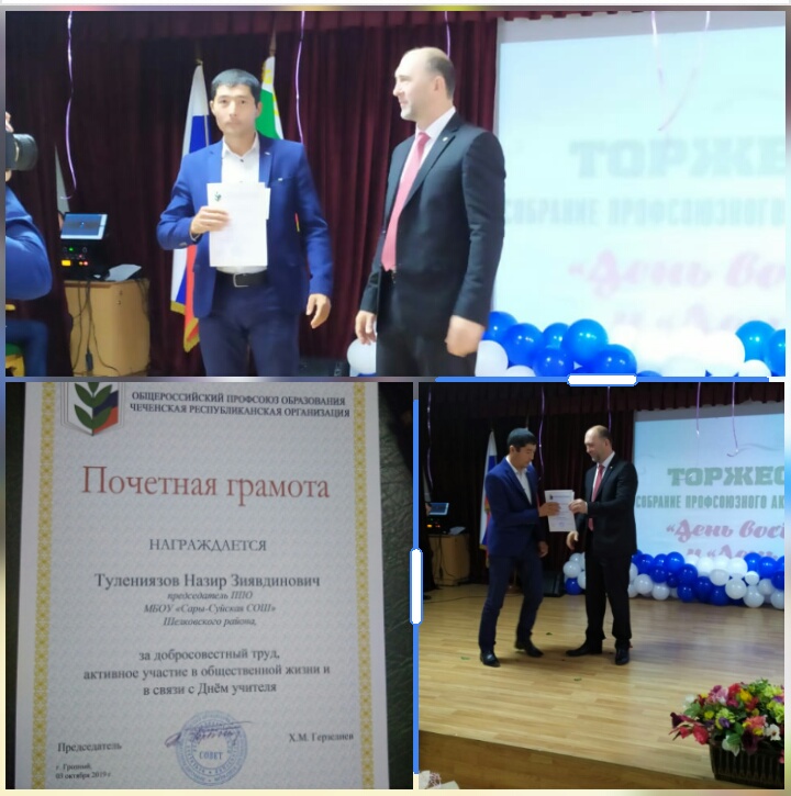 3 октября в Доме профсоюзов Почетной грамотой был награжден Тулениязов Назир Зиявдинович - председатель ППО МБОУ "Сары-Суйская СОШ" за добросовестный труд, за активное участие в общественной жизни и в связи с Днем учителя.