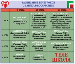 На сайте Министерства образования и науки ЧР опубликовано расписание телевизионных уроков проекта «Телешкола» на 26.04.2020, уроки проходят с 9:00 в эфире ЧГТРК «Грозный».