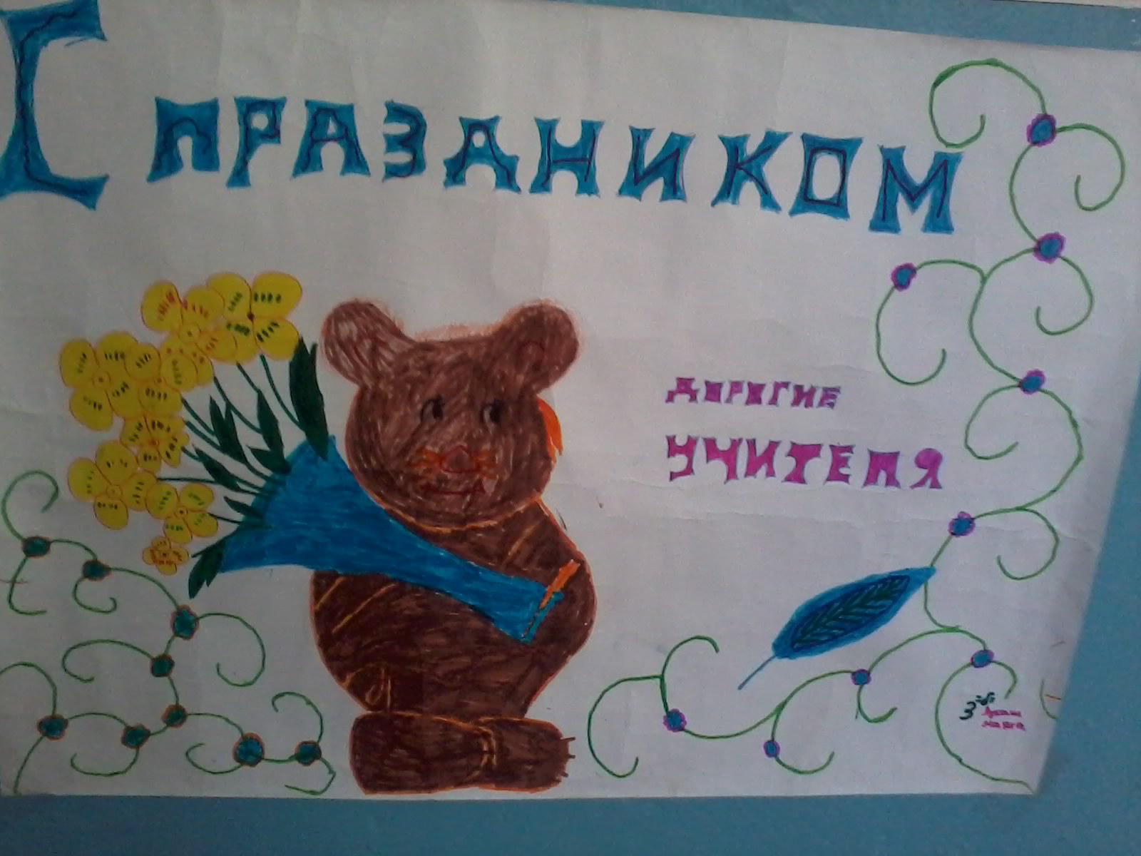 04.10.13г. фойе школы было украшено цветами, шарами. Поздравительные плакаты, которые выпустили все классы школы, украшали вестибюль в течение всей недели. С 1-по 4 октября проходили классные мероприятия, с приглашением учителей- предметников.Обучающиеся 11 класса и их кл. руководитель Агаспарова Е.К. приняли участие в операции «Примите наши поздравления». Они поздравили учителей - пенсионеров, которые уже много лет находится на заслуженном отпуске.4 октября прошел день самоуправления. В день Учителя в школе традиционно проводится День дублера. Старшеклассники в этот день проводят уроки по выбору. Обучающиеся 10-11 классов в этот день смогли прочувствовать и понять важность роли учителя в жизни. Были и директора, и замы…К концу смены состоялось торжественное мероприятие, которое открыла директор школы Елманбетова М.А. Она поздравила учителей с их профес- сиональным праздником, пожелала дальнейших творческих успехов. Поздравительную, литературно-музыкальную композицию «Учитель! Пусть тебя стократ восславят, возблагодарят…» для своих учителей подготовили обучающиеся 11 класса под руководством классного руководителя Агаспаровой Е.К. (это уже стало традицией в нашей школе, когда выпускники ответственны за это мероприятие). От каждого класса в программу вставлен номер, были интересные сценки. Все классы были хорошо подготовлены. Программа была очень насыщенной, много юмора, смеха. Дети подготовили различные конкурсы для учителей, все приняли участие, даже директор и заместители директора участвовали в конкурсах. С 1 по 4 октября проходила выставка цветов, были очень оригинальные букеты, были и букеты – поделки. Отряд «Юный Кадыровец» решили тоже принять участие в праздновании Дня Учителя, они решили оказать свою помощь учителям- ветеранам, которые нуждаются в оказании трудовой поддержки. Так, они побывали у Черноусенко Н.П., Оразманбетовой М.Д., Утомисовой С.У.