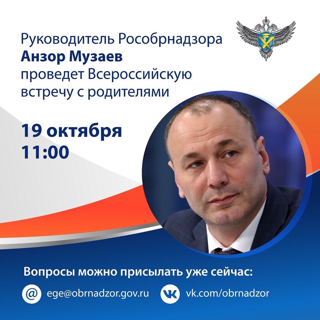 19 октября в 11:00 по Москве руководитель Рособрнадзора Анзор Музаев проведет Всероссийскую встречу с родителями.