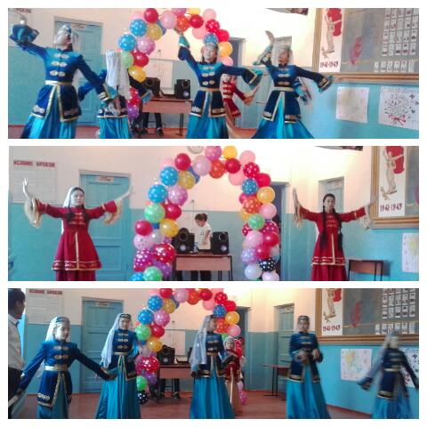 Ведущие программы - ученики 9 "а" класса Ханмурзаев Нурсултан и Магуева Диана. Праздничное оформление фойе организовал классный руководитель Темиралиев В.И.