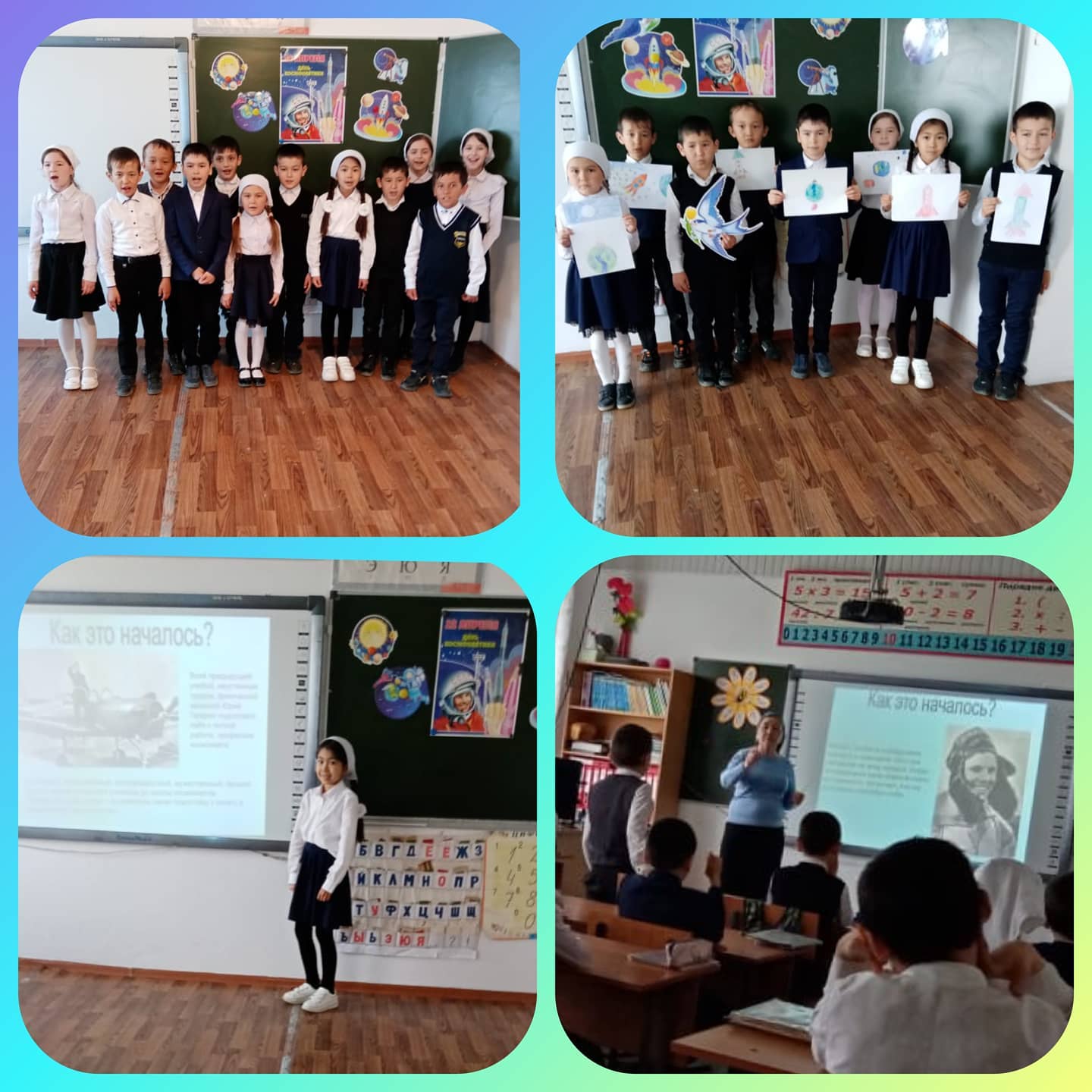 Сегодня во 2" а" классе Аджигайтканова Курбике Нажмудиновна провела беседу на тему: "Первый покоритель космоса".