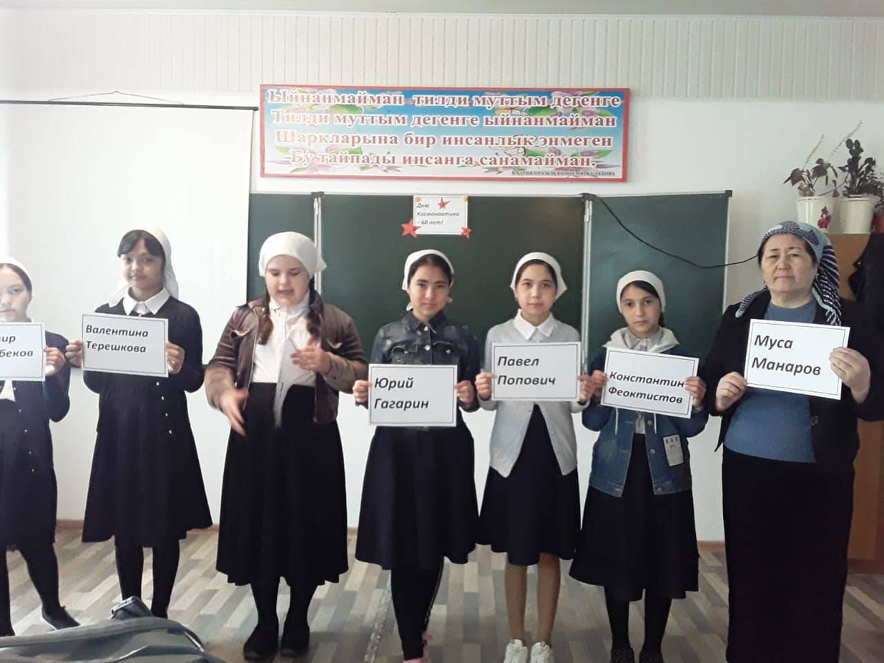 Кельдихан Умерзаковна рассказала учащимся, что ровно 60 лет назад первым в мире полетел в космос, именно, советский человек Юрий Гагарин.