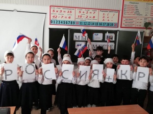 Сегодня, 18 марта, в 3 "a" классе Байрамбаева Еминат Касымовна провела классный час "Мы вместе". Цель: знакомство с историей и географическим расположением Крымского полуострова, воспитание любви к своему Отечеству, проявление уважения к истории России, гордости за свою страну и её народ.