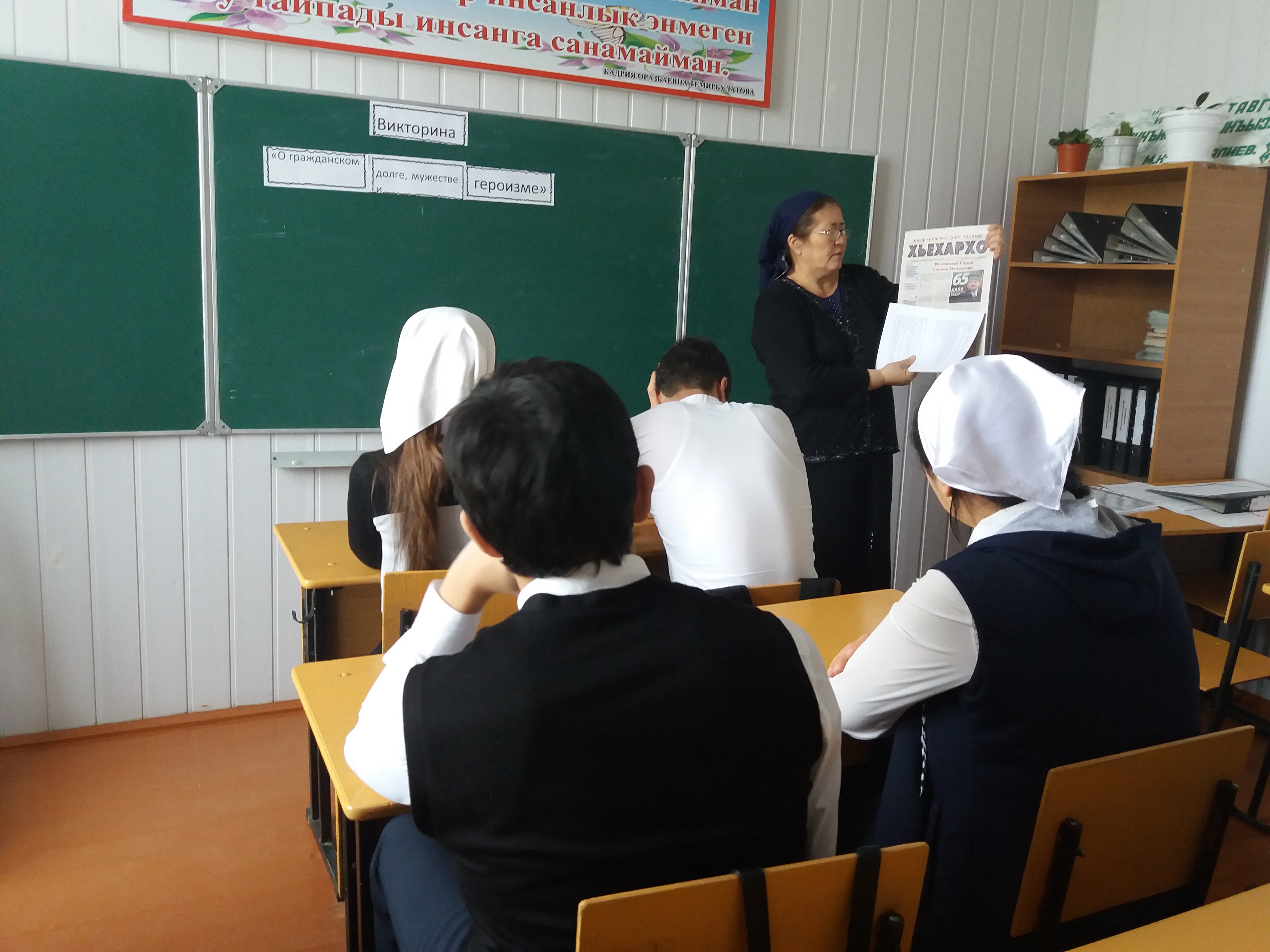 Шамбилова К.У провела викторину в 10 классе «О гражданском долге, мужестве и героизме». В первой части урока говорили о празднике, о героях, а затем проведена викторина на тему жизнедеятельности А.Х. Кадырова.