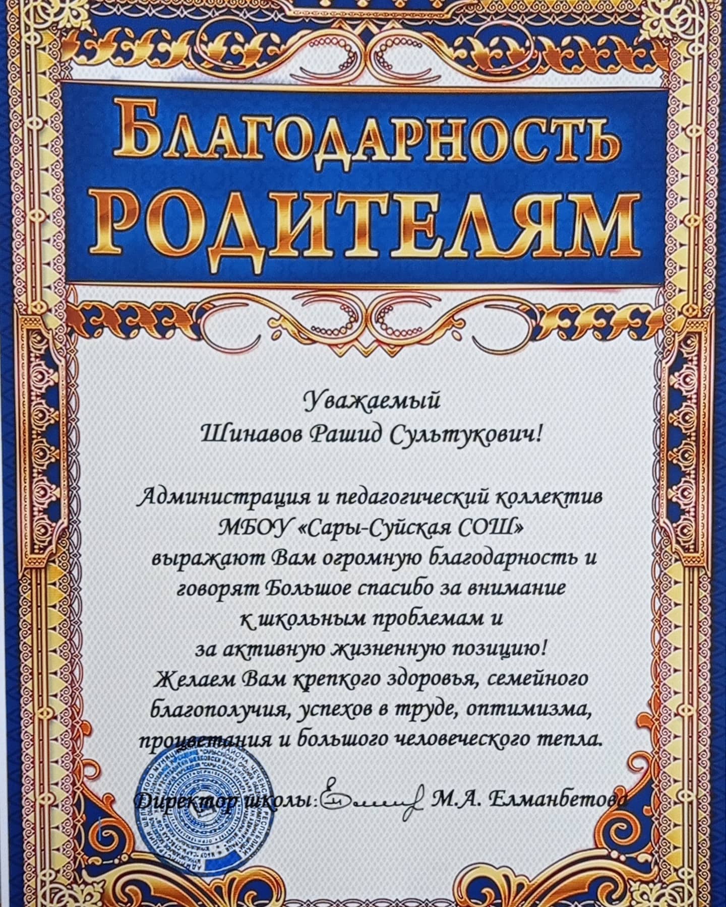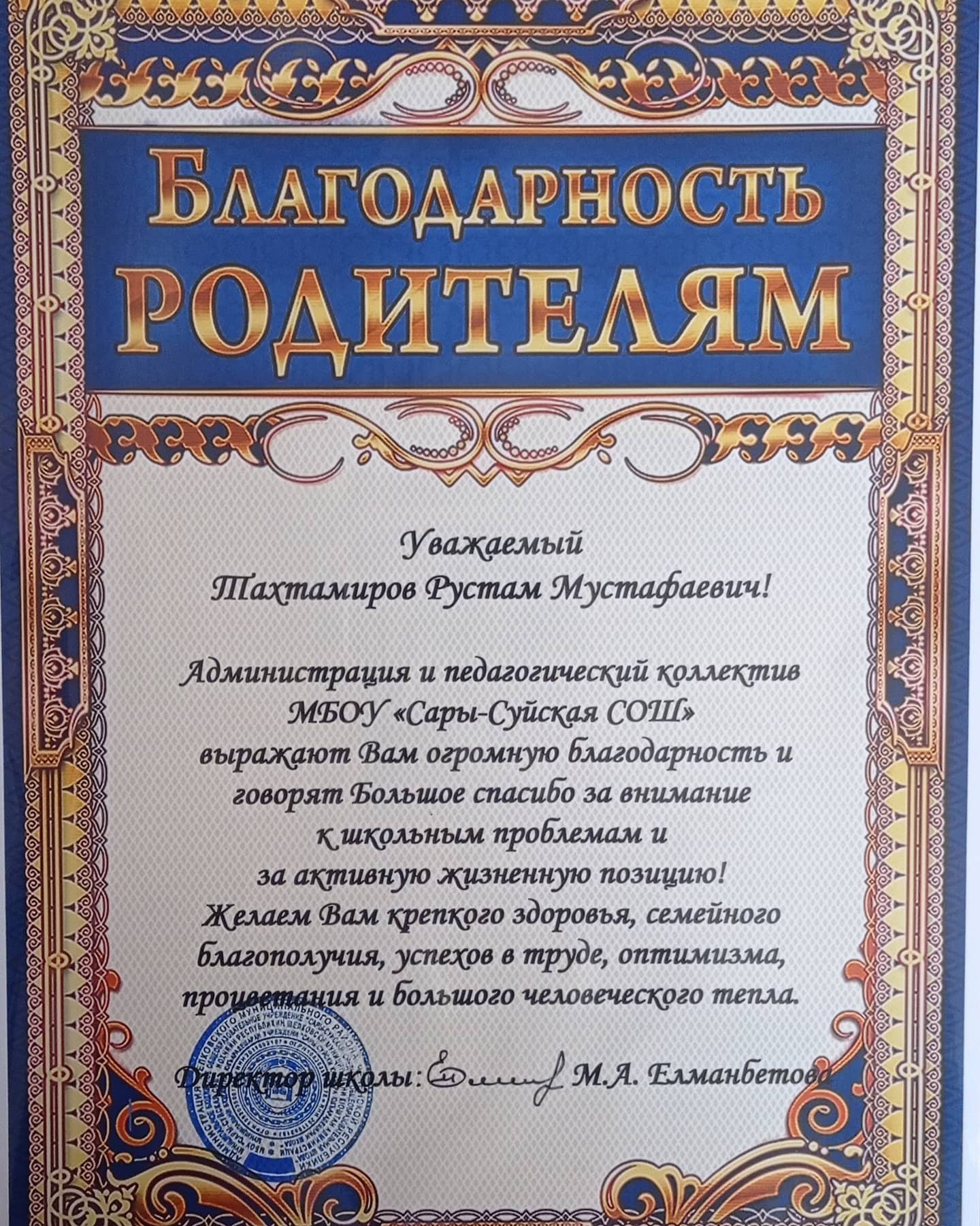 Администрация и педагогический коллектив МБОУ "Сары-Суйская СОШ" выражают огромную благодарность и говорят Большое спасибо Шинавову Рашиду Сультуковичу, Тахтамирову Рустаму Мустафаевичу, Шамавову Абубакару Янтемировичу за внимание к школьным проблемам и за активную жизненную позицию!