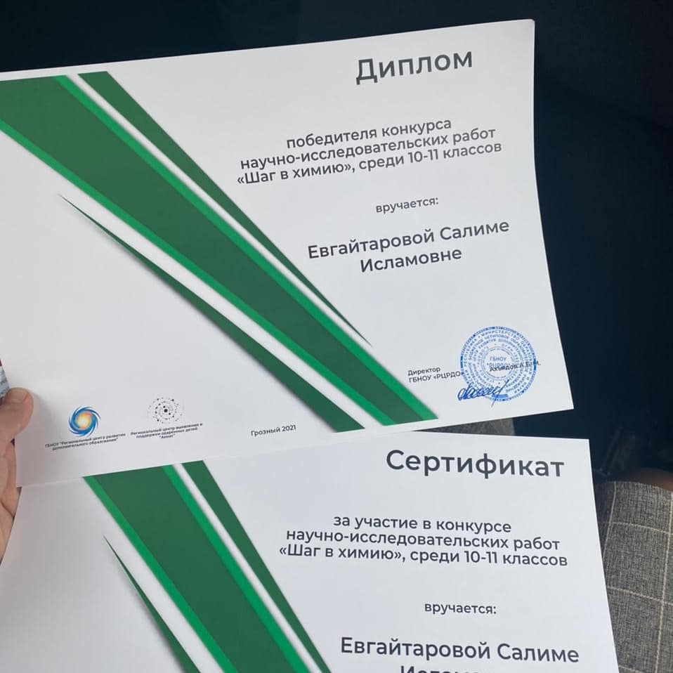 Конкурс научно-исследовательских работ "Шаг в химию"🧪 состоялся в четверг 9 декабря в ГБНОУ "Региональный центр развития дополнительного образования"📍г.Грозный, в котором приняла участие наша ученица 11 класса Евгайтарова Салима и заняла призовое место, под руководством учителя Койлюбаевой Зульфии Мустафаевны.