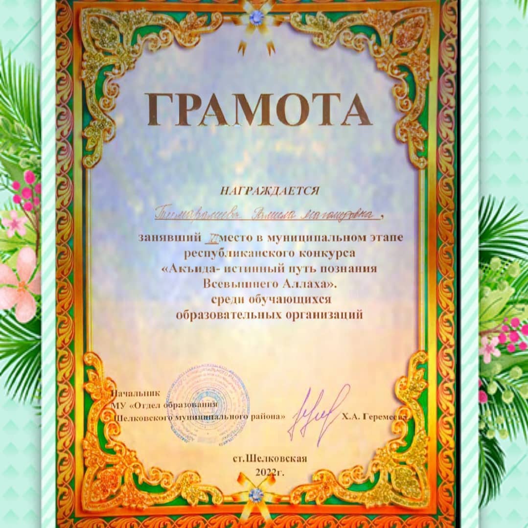 Сегодня, 24 февраля, в ст. Шелковская состоялся муниципальный этап республиканского конкурса "Акъида - истинный путь познания Всевышнего Аллаха". Наша ученица 10 класса - Тимаралиева Рамила приняла участие в конкурсе и заняла III - место среди обучающихся образовательных организаций.