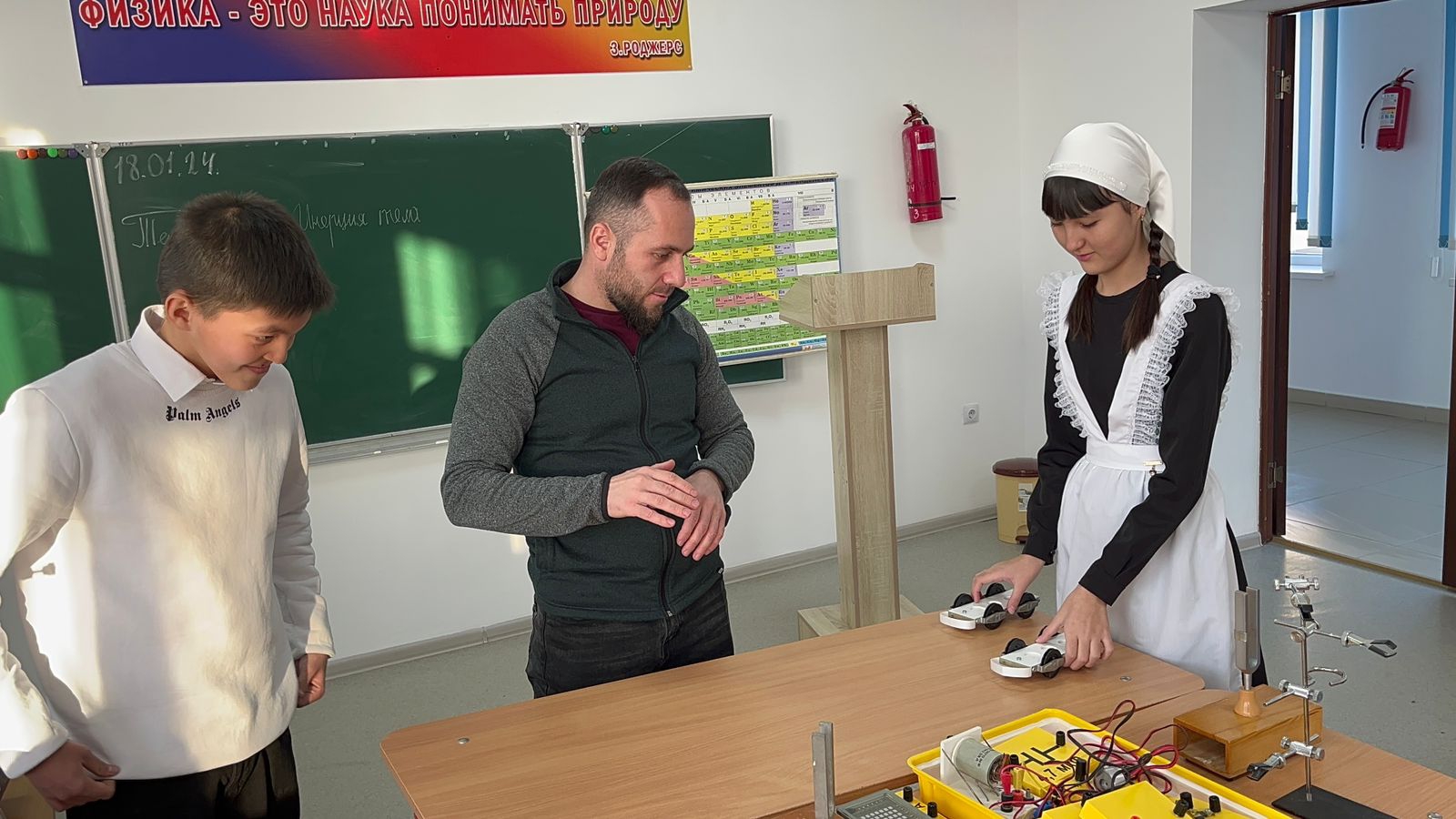Учителем физики Байхановым Р.Р., на уроке физики в 7 классе было проведено практическое занятие по теме "Инерция", где была использована модель автомобиля и плоскости прямые, под наклоном, чтоб убедиться, как же на практике влияет трение на движение даной модели. После чего были сделаны соответствующие выводы и дано понятие инерции как способности сохранять скорость телом, при отсутствии действия на него других тел со стороны.