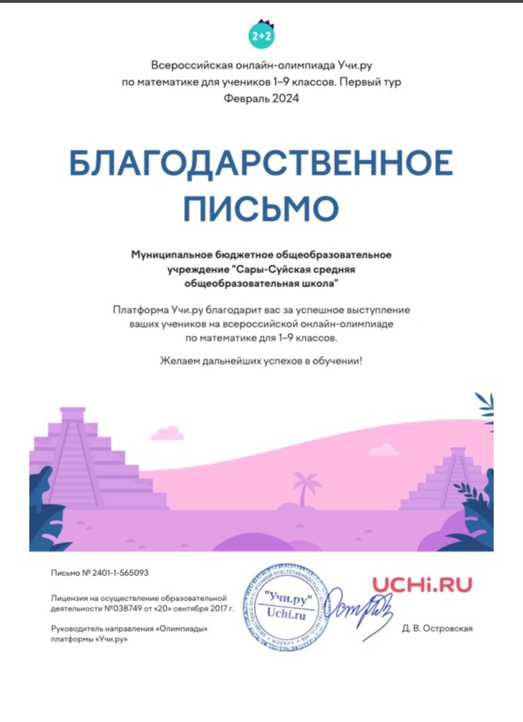 Платформа Учи.ру благодарит МБОУ "Сары-Суйская СОШ" за успешное выступление наших учеников на всероссийской онлайн-олимпиаде по математике для 1-9 классов.