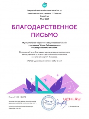 Благодарственным письмом награждается МБОУ "Сары-Суйская СОШ" за успешное выступление учеников на всероссийской онлайн-олимпиаде по математике для 1-9 классов.