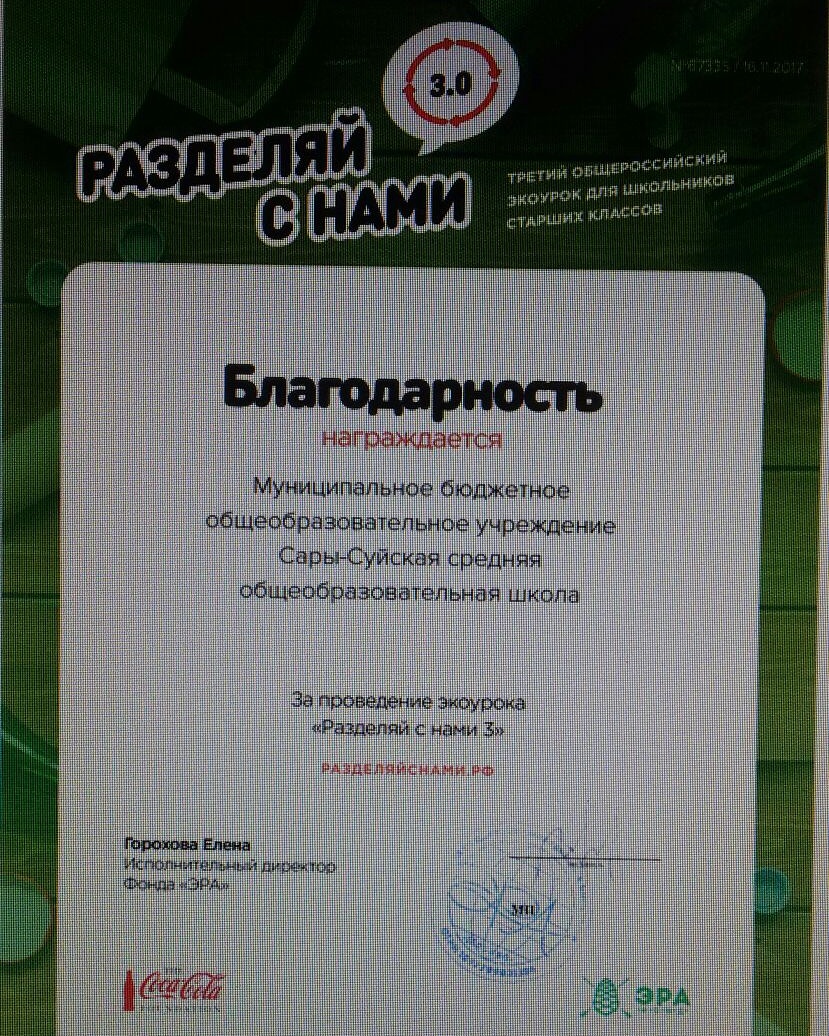 Благодарсть нашей школе за проведение экоурока "Разделяй с нами 3"