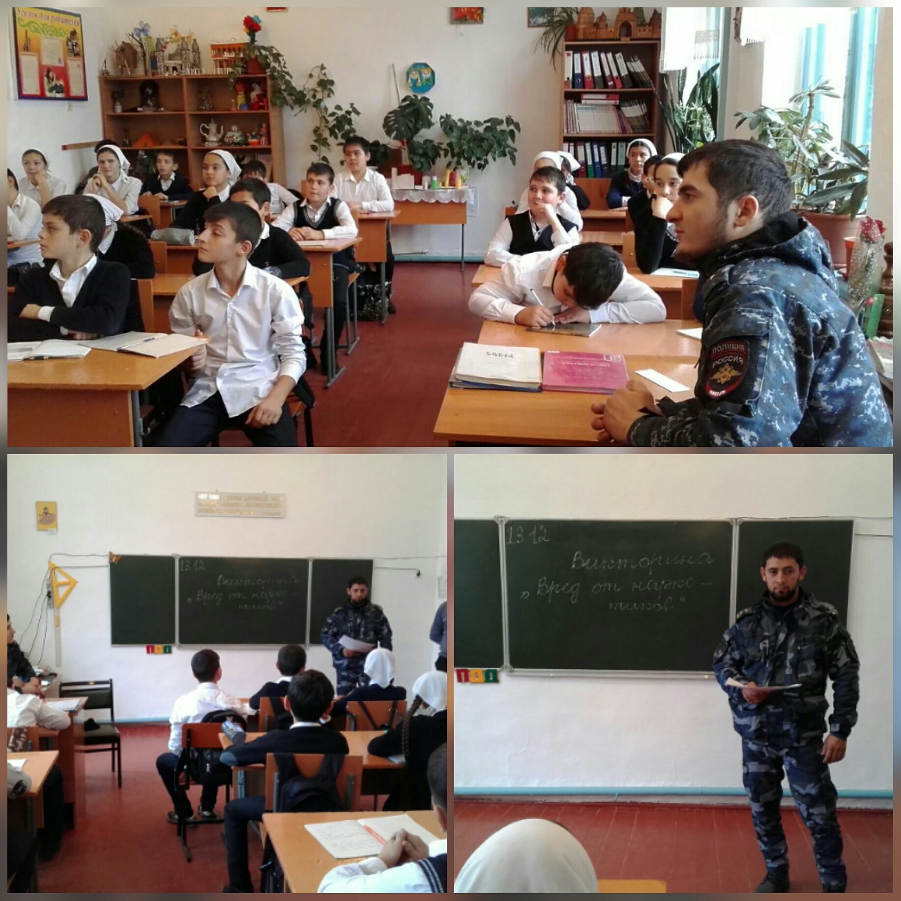 13.12.201713 декабря школу посетили инспектор ПДН Абдурахманов Х. и старший УУП ОМВД России по Шелковскому Району Джимакаев А.А. Говорили о токсикомании и токсикоманах, пытались выяснить, насколько дети осведомлены в этой области.После профилактической беседы с обучающимися, они провели викторину "Вред от наркотиков". Работа проводилась с обучающимися 6-7 классов.