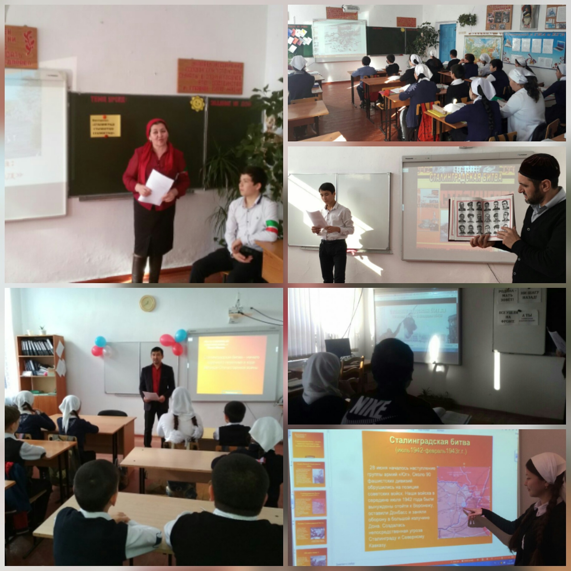 02.02.20182 февраля мы отмечаем День воинской славы России - Деньразгрома советскими войсками немецко-фашистских войск в Сталинградской битве в 1943г. Сталинград и его защитники стали символом мужества, героизма и Победы.В этом году мы отмечаеи 75-летие. В связи со знаменательной датой с 29 января по 2 февраля по школе проведены ряд мероприятий.