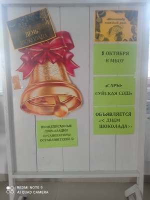 Родиной Всемирного дня шоколада является Франция. В 1995 году именно французы придумали этот праздник. Шоколад — это кондитерское изделие, изготовленное из какао продуктов и сахара.В МБОУ "Сары-Суйская СОШ" 9 октября был объявлен Днём шоколада. Сладости с указанием адресатов закидывались в коробки. В понедельник каждый адресат получит свой сладкий сюрприз 🤫
