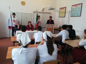Оразманбетова М.Д. в 5 «б» классе провела урок истории по теме «Конституция Чеченской республики». Ребята рассказали о своих правах и обязанностях, описали герб, флаг нашей республики. Исполнили гимн ЧР, лучшим исполнителем гимна стала Темиралиева Рамила.