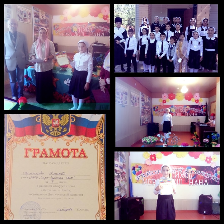 13 сентября ученица 4 класса, Ибрагимова Аминат, приняла участие в районном конкурсе стихов "Мерза дош - Нана!", посвященном Дню чеченской женщины, в котором заняла 2 место.