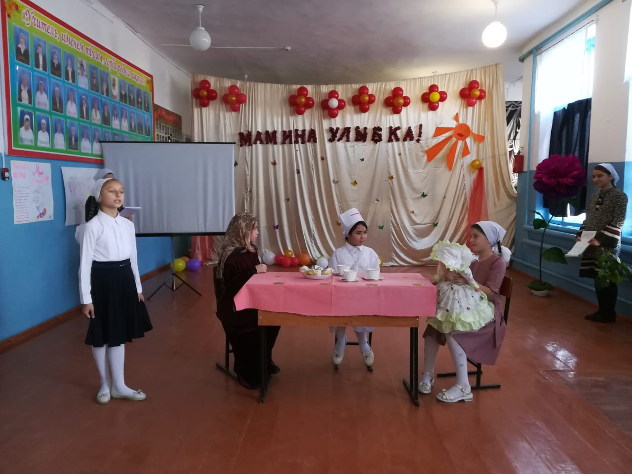 24 ноября проведена общешкольная праздничная программа «Мамина улыбка!». Организаторами программы были 6 класс и руководитель класса Даутова З.Б. Красочно оформили фойе и коридор школы, собрали номера со всех классов и устроили праздник для мам!!! Мамам не пришлось скучать на празднике, они тоже были вовлечены в программу, для них были конкурсы и игры!!!