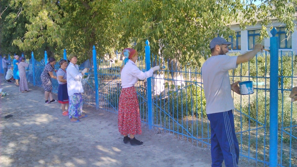 20.08.2015 г. был проведен субботник по благоустройству территории школы. В субботнике были задействованы учителя школы. Они были заняты покраской ограждения на территории.