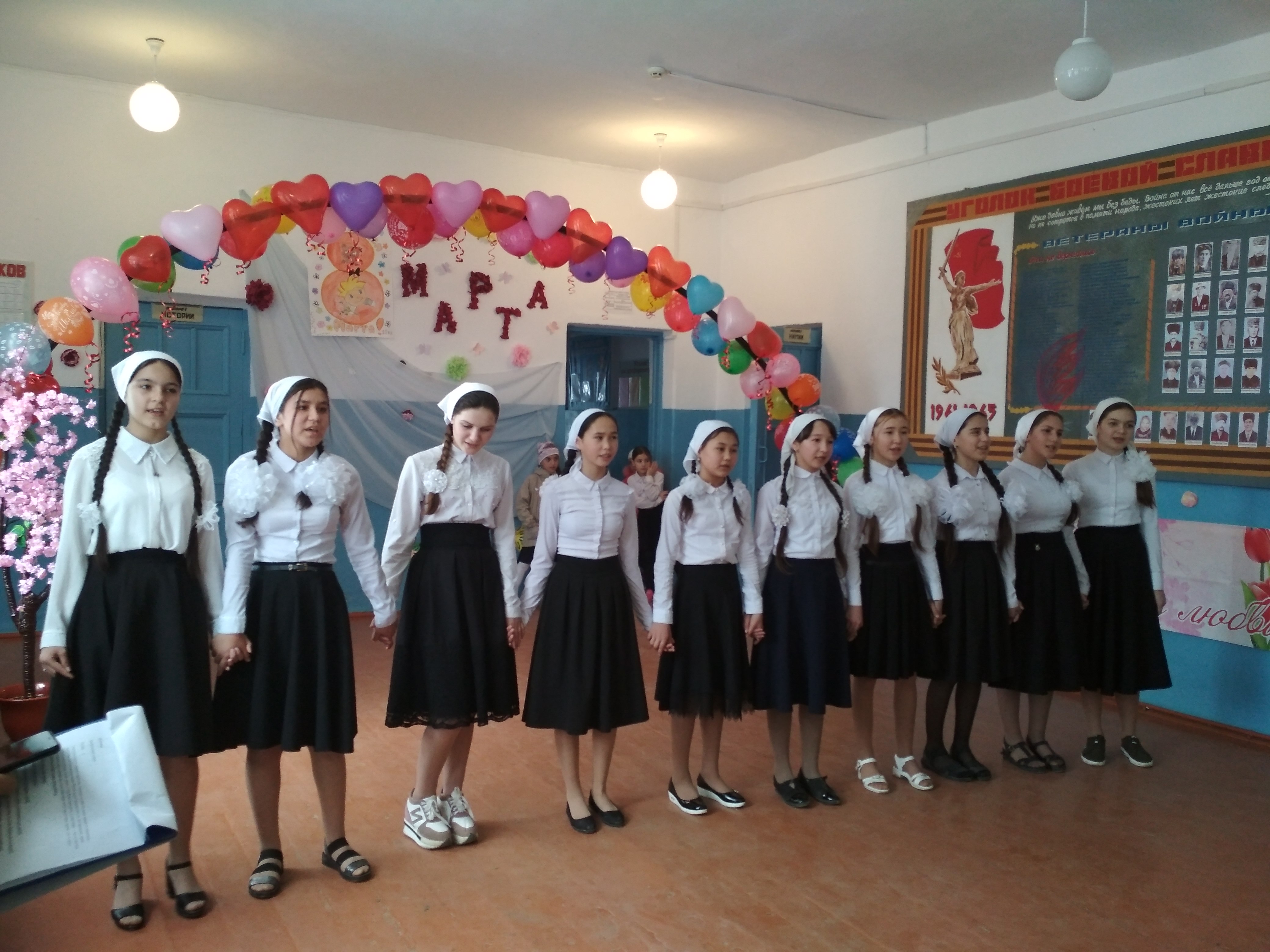 Проведены беседы, чаепития с приглашением мам, «А ну – ка, девочки!». Очень интересно, совместно с родителями, прошли мероприятия в 1-х классах. Были показаны театрализованные представления, проходившие в классах, оформленном в стиле весенней полянки, с использованием технических средств (мультимедийная установка, муз. центр), обилием атрибутов и разнообразием костюмов, изготовленных умелыми руками родителей. На внутриклассных мероприятиях дети с огромным удовольствием читали стихи, пели песни, исполняли танцы. Родители и дети получили «заряд» праздничного весеннего настроения. Обучающиеся 11класса, вместе с Темиралиевым В.И. посетили и поздравили многодетные семьи.