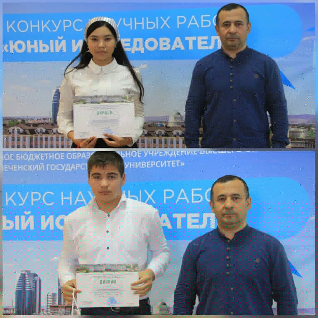 17.05.2019ФГБОУ высшего образования "Чеченский государственный университет" был объявлен конкурс научных работ "Юный исследователь" среди обучающихся 8-10 классов. Наша школа приняла участие в Конкурсе, в котором заняла 1 и 2 места. Евгайтарова Салима, ученица 8 класса, под руководством Шамановой Т.З., заняла 1 место в республике по информатике. Даутов Амир, ученик 8 класса, под руководством Тилекова А.Р., занял 2 место по истории.